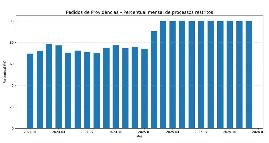 Os dados mostram que, em 2024, o percentual mensal de Pedidos de Providências com restrição já era elevado, oscilando em geral entre 60 e 80 por cento, com média anual de 73,74 por cento. Em 2025, porém, há uma piora na transparência. Em fevereiro de 2025 o percentual salta para cerca de 90 por cento e na sequência se praticamente se iguala a 100 por cento.