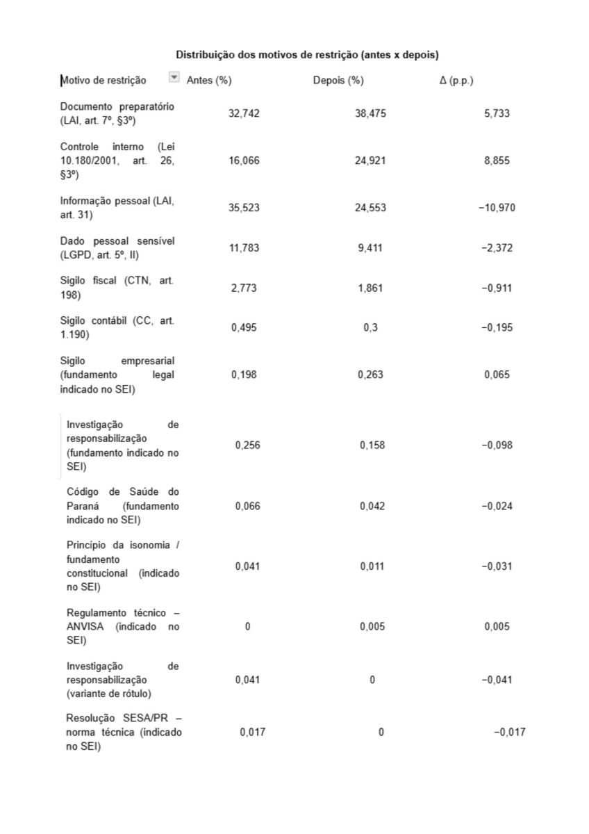 Após a mudança de comportamento, cresceu o uso de motivos mais abrangentes e procedimentais. O motivo “Documento Preparatório” aumentou de 32,74 por cento para 38,48 por cento. O motivo “Controle Interno” subiu de 16,07 por cento para 24,92 por cento. Somados, esses dois fundamentos passaram de 48,81 por cento para 63,40 por cento das restrições. Em contrapartida, justificativas diretamente ligadas à privacidade perderam participação. O motivo “Informação Pessoal” caiu de 35,52 por cento para 24,55 por cento. O motivo “Dado pessoal sensível “caiu de 11,78 por cento para 9,41 por cento. Em síntese, os dados indicam não apenas aumento da restrição, mas também mudança no modo de justificar a restrição, com preferência crescente por fundamentos mais genéricos.
